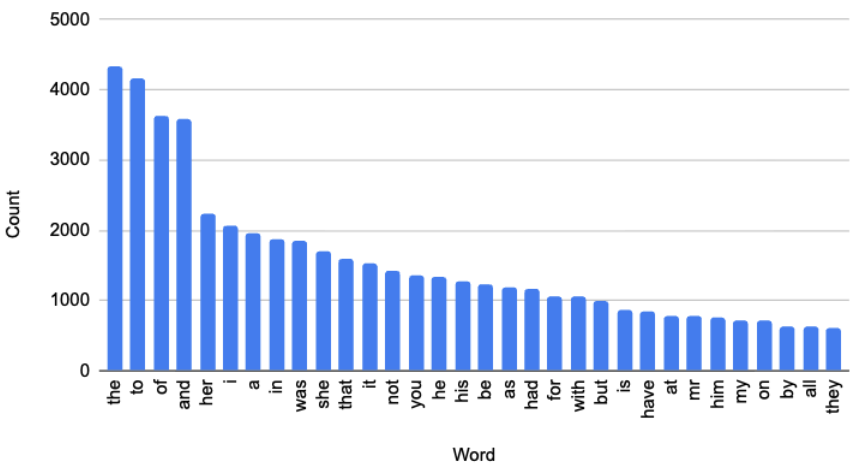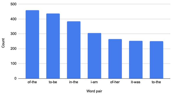 - If I had included just one more bar in the “word-pair histogram” bar graph above, you would have seen that “mr-darcy” appears 243 times, which would have spoiled the surprise. ↩︎